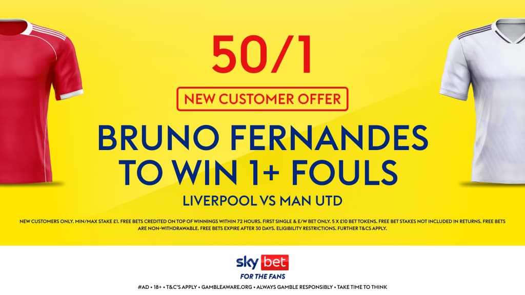 For this game, SkyBet have an excellent sign up offer for new customers, offering boosted odds of 50/1 for United captain Bruno Fernandes to win 1+ fouls. Put simply, if Bruno Fernandes is fouled one or more times, SkyBet will credit your new account with five £10 free bet tokens.