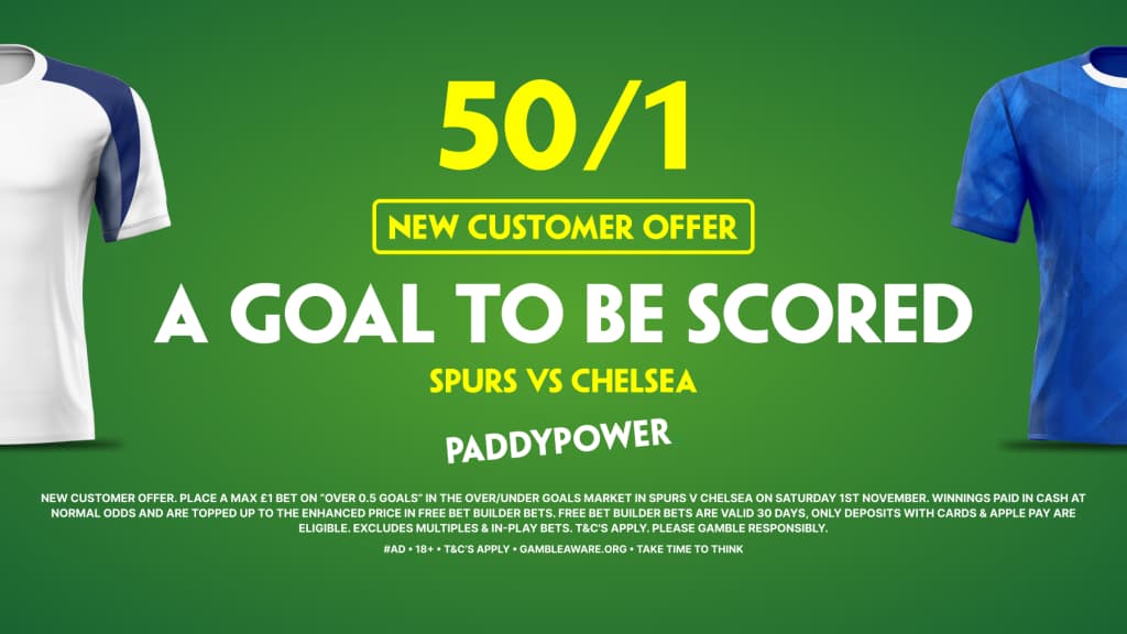 Paddy Power are offering new customers enhanced winnings of 50/1 on Over 0.5 Goals between Tottenham Hotspur and Chelsea this weekend. This means that if either team scores a single goal, you will receive up to £50 worth of bet builders, should the bet be successful.