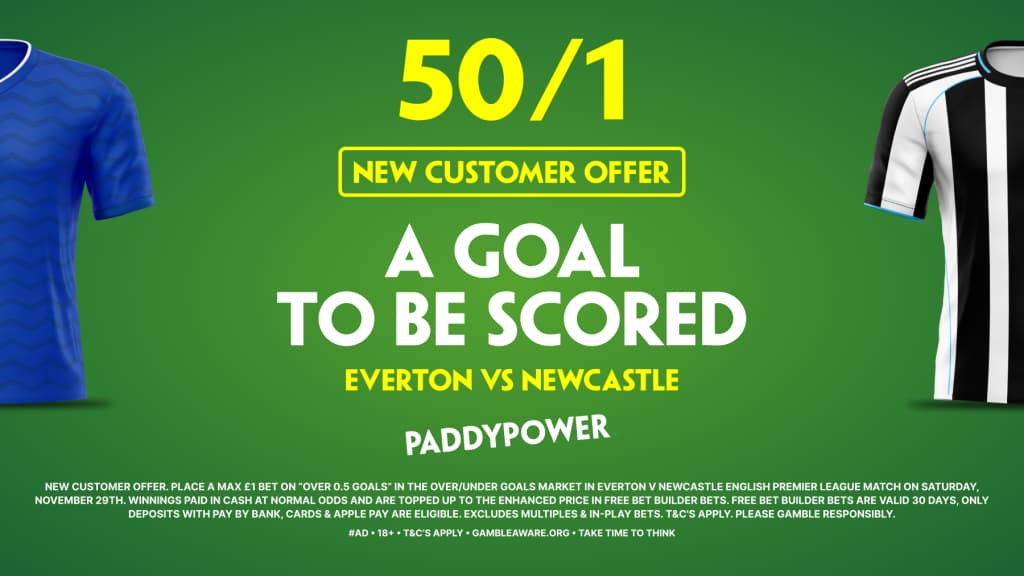 Paddy Power have this tremendous offer for new customers, with enhanced odds of 50/1 for a goal to be scored in this fixture. All you have to do is follow the steps below, and place a max £1 bet on the Over 0.5 goals market in the game between Everton and Newcastle this Saturday, and you can receive £50 worth of bet builders to use.