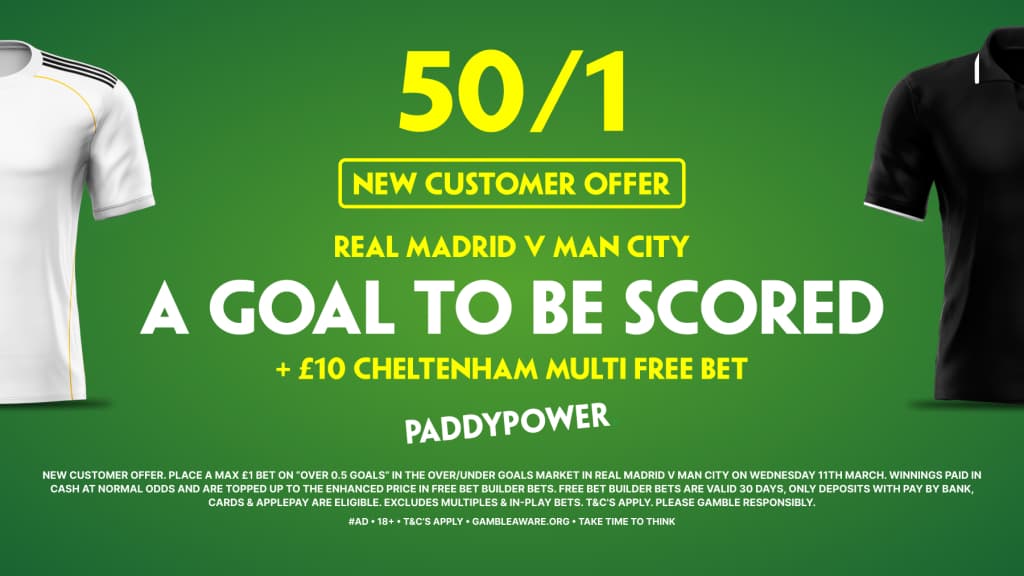 Paddy Power are giving new customers enhanced odds of 50/1 for a goal to be scored in Real Madrid vs Manchester City, with this new sign up offer today. All you have to do is follow the steps below on this page and you could be walking away with £50 in Free Bets with Paddy Power's Sign Up Offer.