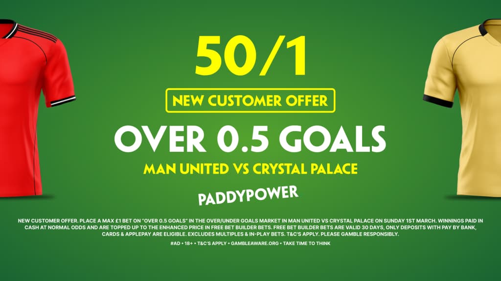 Paddy Power has a fantastic offer for new customers this weekend, with odds of 50/1 for over 0.5 goals to be scored in Sunday's Premier League clash between Manchester United and Crystal Palace at Old Trafford.