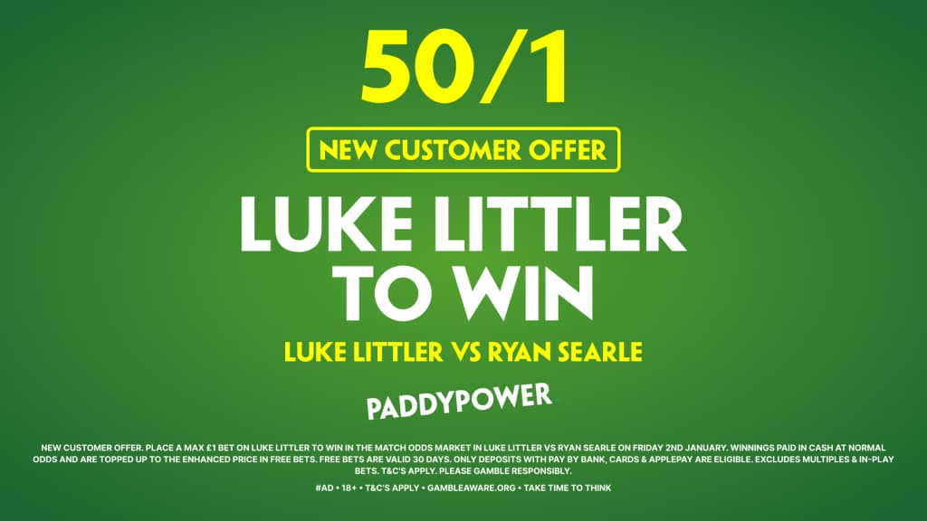 Paddy Power are offering new customers enhanced odds of 50/1 for Luke Littler to beat Ryan Searle in the semi-final on Friday. All you have to do is claim this offer and place a £1 bet on Littler to win. Should Littler overcome Searle, you will get £50 worth of bet builders.
