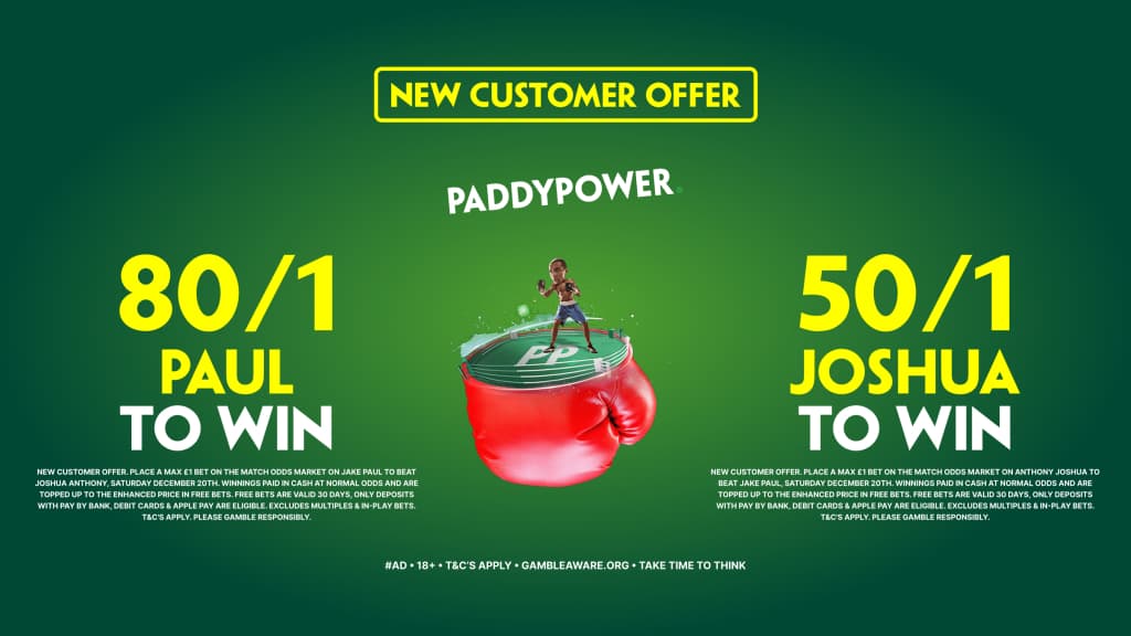 Paddy Power are giving away enhanced odds of 50/1 for Anthony Joshua to beat Jake Paul this weekend, and alternatively odds of 80/1 for Jake Paul to beat Anthony Joshua.