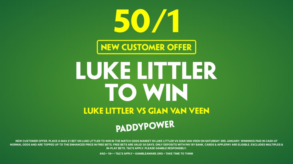 Paddy Power are putting all their eggs in one basket with this welcome offer for new customers, offering enhanced odds of 50/1 for Luke Littler to beat Gian van Veen.