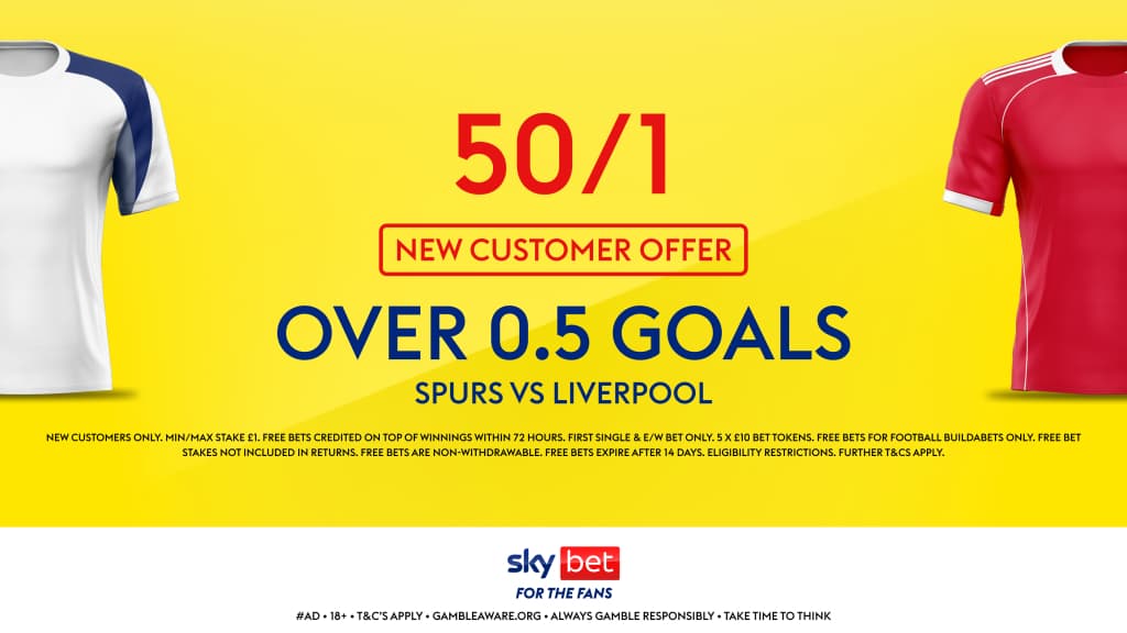 Sky Bet are offering new customers enhanced odds of 50/1 this weekend on Over 0.5 goals to be scored in Tottenham Hotspur vs Liverpool.