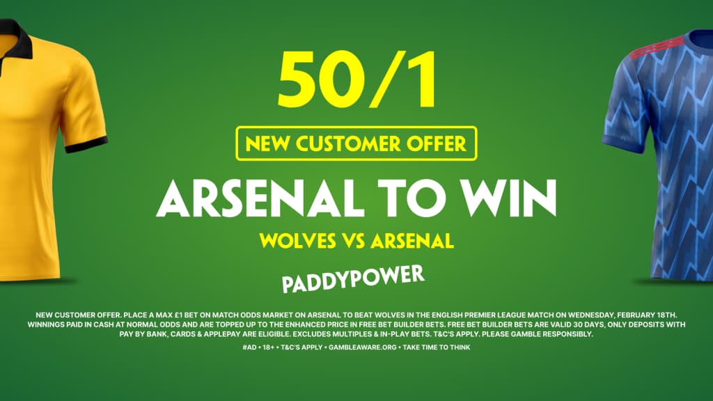 Paddy Power are backing the Gunners for a win here, as their new customer offer is providing enhanced odds of 50/1 for Arsenal to beat Wolves!