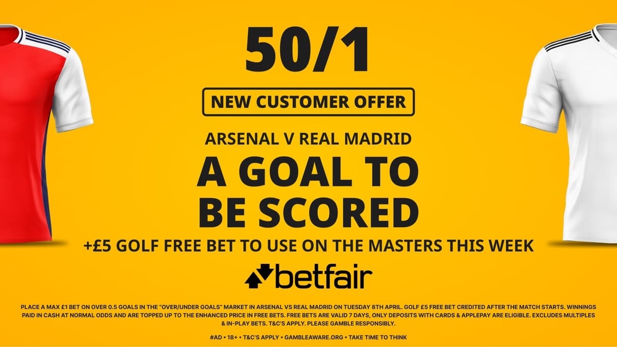 Betfair have massively boosted their odds for this game as New Customers can take advantage of this enhanced odds offer: A goal to be scored between Arsenal and Real Madrid at 50/1 + £5 Free Bet on the Masters.