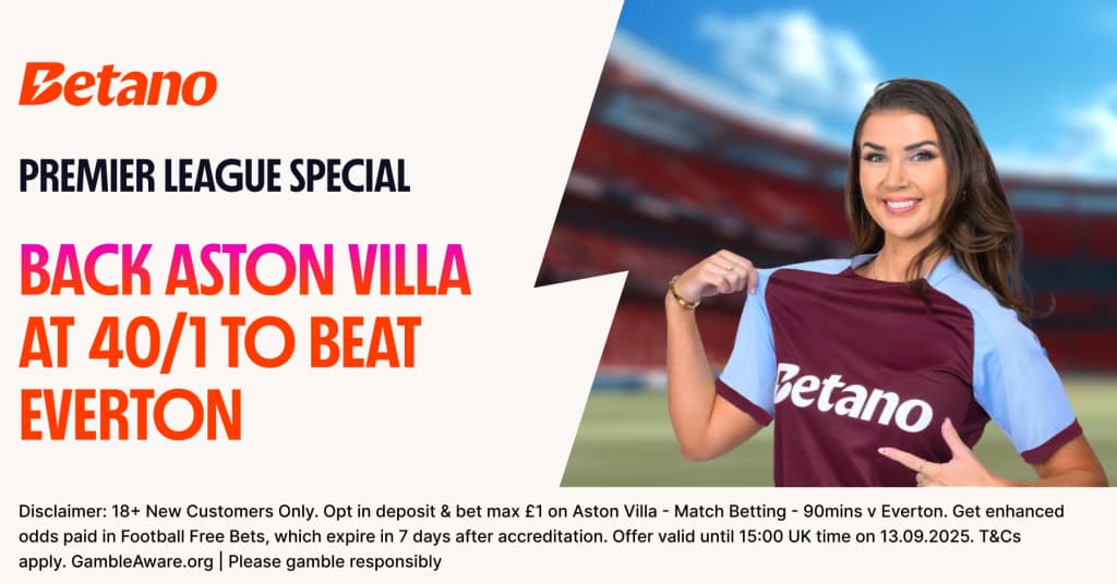- Place your qualifying* bet, a max £1 bet at the normal price on Aston Villa - Match Betting - 90mins v Everton, which kicks off at 15:00 on 13.09.2025.