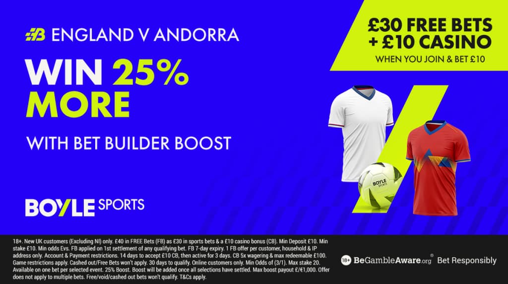 BOYLE Sports are offering a 25% boost on your first bet builder for England's clash with Andorra on Saturday in the World Cup qualifiers. This offer applies to the first bet builder bet of 3/1+ you place, and will be added once all selections have been selected up to a maximum of €/£1,000. Along with their 25% boost on bet builders, BOYLE Sports are also offering new players a sign up offer that includes £30 in free bets and a £10 casino bonus.