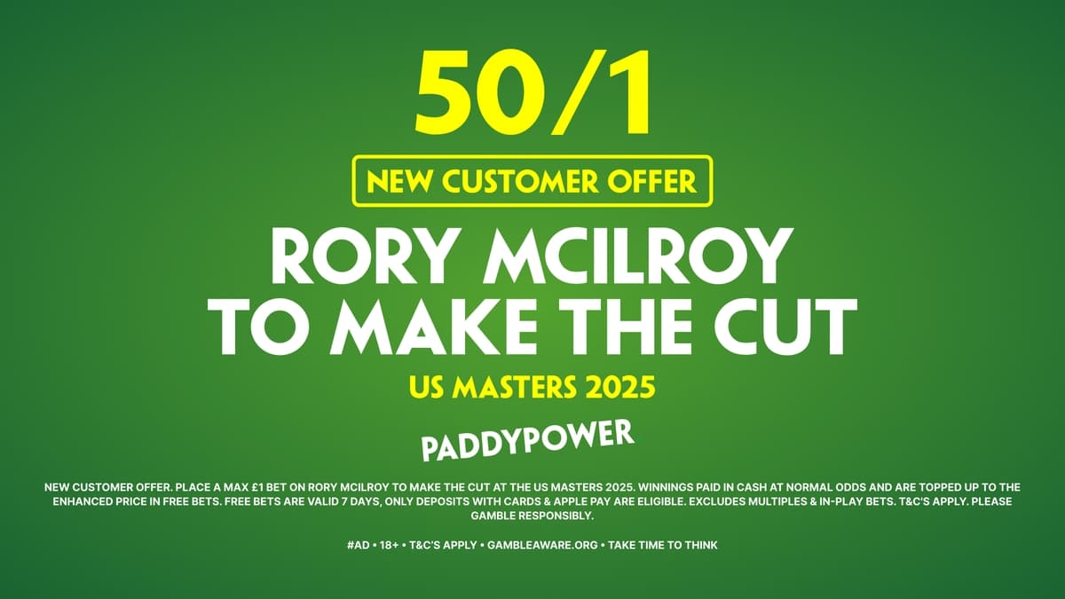 Paddy Power have massively boosted odds exclusively for new customers for McIlroy to make the cut: Rory McIlroy to Make the Cut for the Masters 50/1.