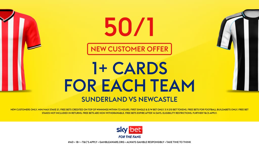 Sky Bet are offering a huge 50/1 on each team receiving a card in the Sunderland vs Newcastle match on Sunday!