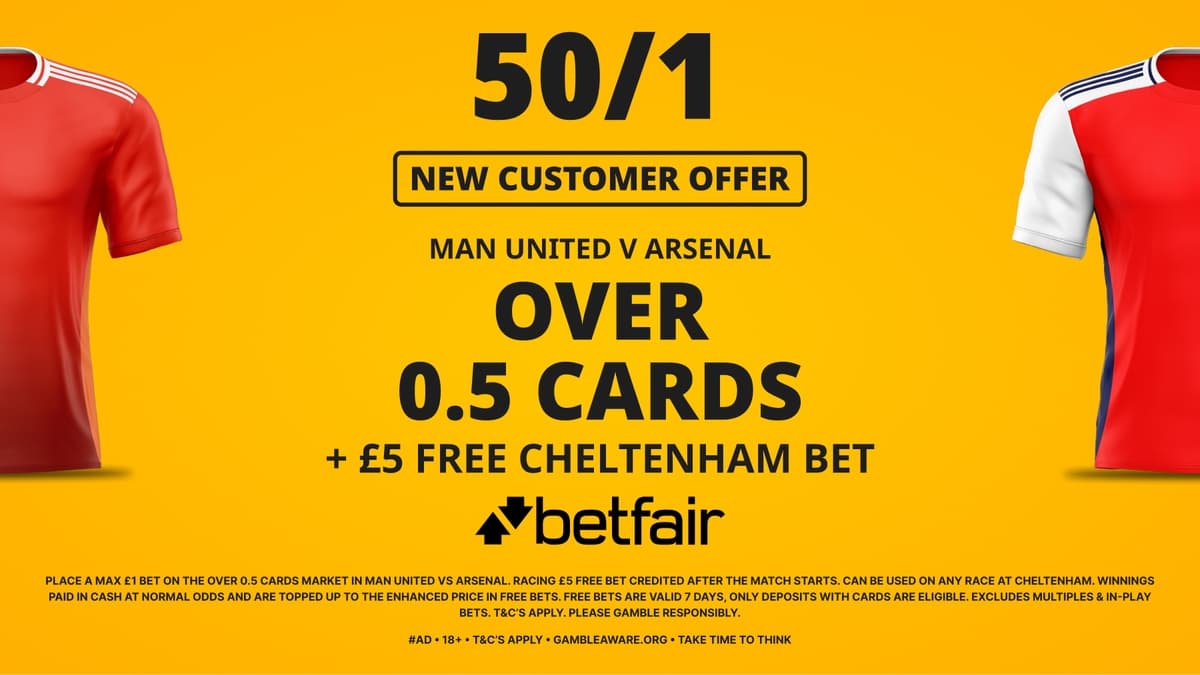 Betfair have massively boosted their odds for 0.5 cards to be shown in this game. New Customers can take advantage of this enhanced odds offer: Over 0.5 cards to be shown in Man Utd vs Arsenal at 50/1.